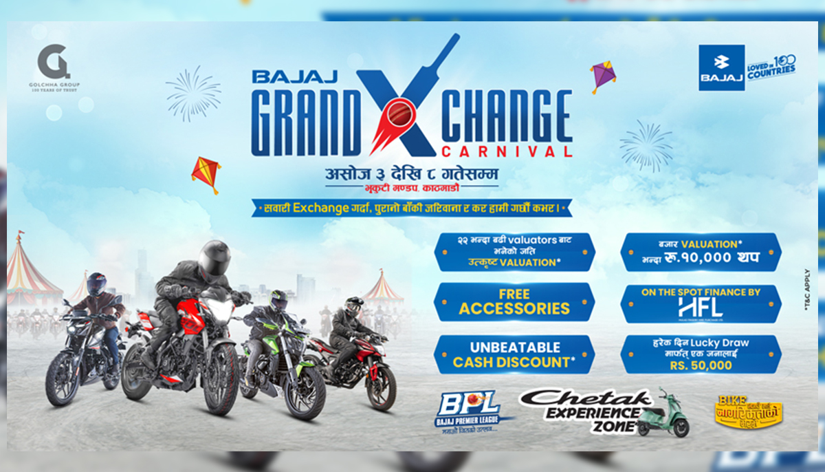 Kathmandu is set to witness Nepal’s biggest two-wheeler exchange event as Bajaj hosts the Grand Xchange Carnivalat Bhrikuti Mandap from September 19 to 24, 2025 (Ashoj 3–8).