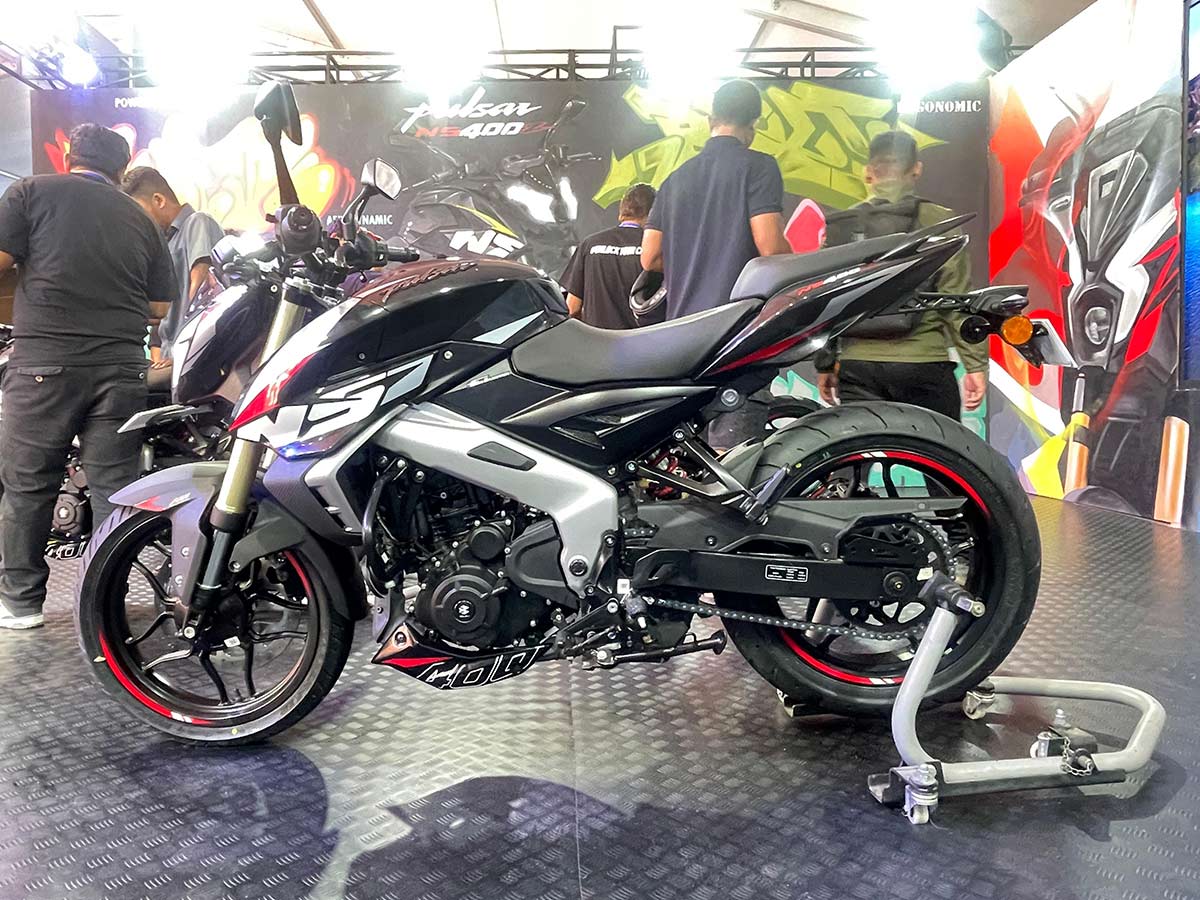 The Pulsar NS400Z has a 12-litre fuel tank and a seat height of 805mm. The Pulsar NS400Z uses an underbelly exhaust, similar to the smaller NS200.