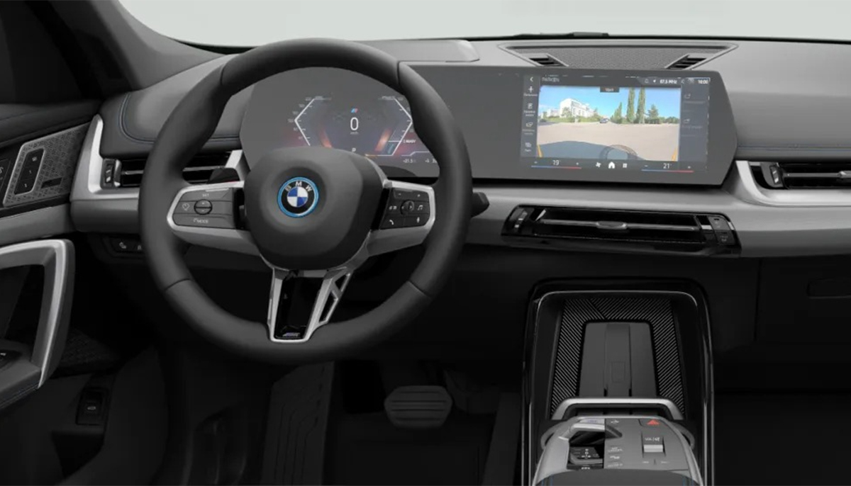 BMW iX1 e20 EV includes dual-zone automatic climate control, a 10.25-inch digital instrument cluster, a 10.7-inch central touchscreen running BMW Operating System 9, wireless Apple CarPlay and Android Auto, and a rearview camera. Optional features may include adaptive LED headlights and a panoramic glass sunroof.