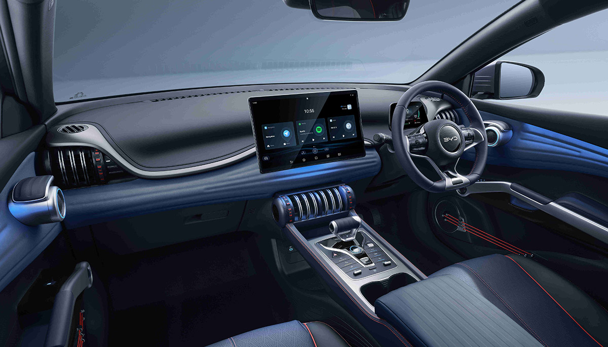 The BYD Atto 3 comes loaded with a variety of premium features, including a wireless charger, a panoramic sunroof, a 15.6-inch rotating touchscreen, an air purifier, 31-colour ambient lighting, four USB ports, a 360-degree camera,and an eight-speaker sound system.