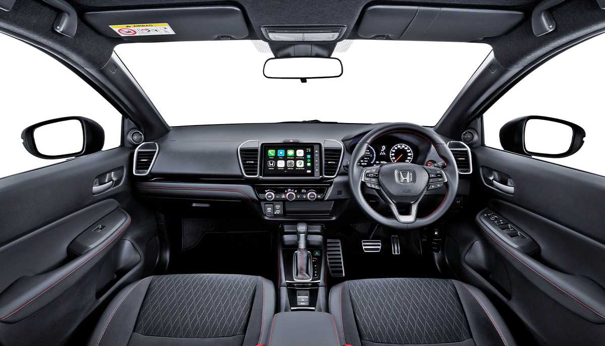 Honda City 5TH GEN features a sleek exterior design with full LED headlamps, Z-shaped 3D wrap-around LED tail lamps, and a shark fin antenna. Inside, it offers a spacious cabin with premium leather upholstery, an electric sunroof, and ambient lighting. The infotainment system includes an 8-inch touchscreen compatible with Apple CarPlay and Android Auto, along with a rearview camera for parking assistance. Convenience features comprise keyless entry with push-button start, automatic climate control, and rear AC vents. Safety and technology are enhanced with Honda LaneWatch™, agile handling assist, and multiple airbags.