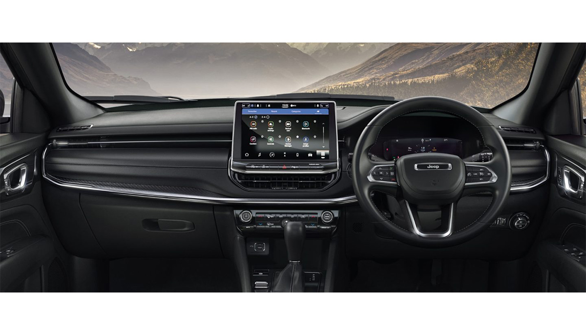 Jeep Compass comes equipped with a touchscreen infotainment system available in 8.4-inch or 10.1-inch sizes depending on the variant, supporting wireless Apple CarPlay and Android Auto. It includes a 10.25-inch fully digital instrument cluster, wireless charging pad, and a 360-degree camera system. Comfort and convenience features consist of 8-way power-adjustable front seats with memory, ventilated leather upholstery, dual-zone automatic climate control, a power liftgate, and a dual-pane panoramic sunroof. Additional technology includes rain-sensing wipers, automatic headlamps, electronic stability control, hill start assist, and a tire pressure monitoring system, all integrated to support daily driving and safety.