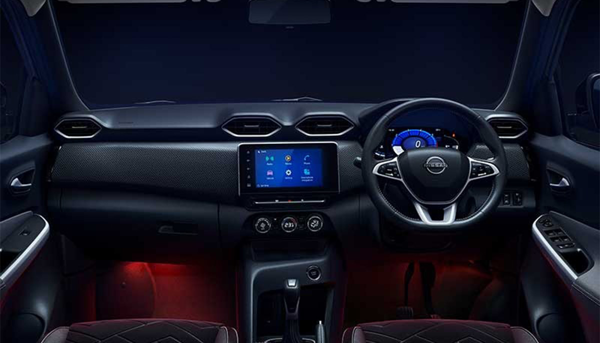 Nissan Magnite features a modern design with LED bi-projector headlamps, LED daytime running lights, and 16-inch diamond-cut alloy wheels. Inside, the cabin offers an 8-inch touchscreen infotainment system compatible with Apple CarPlay and Android Auto, along with a 7-inch TFT instrument cluster. Comfort and convenience are enhanced by automatic climate control, keyless entry with push-button start, and a rear-view camera. Technological features include a tire pressure monitoring system and vehicle dynamic control for improved safety.