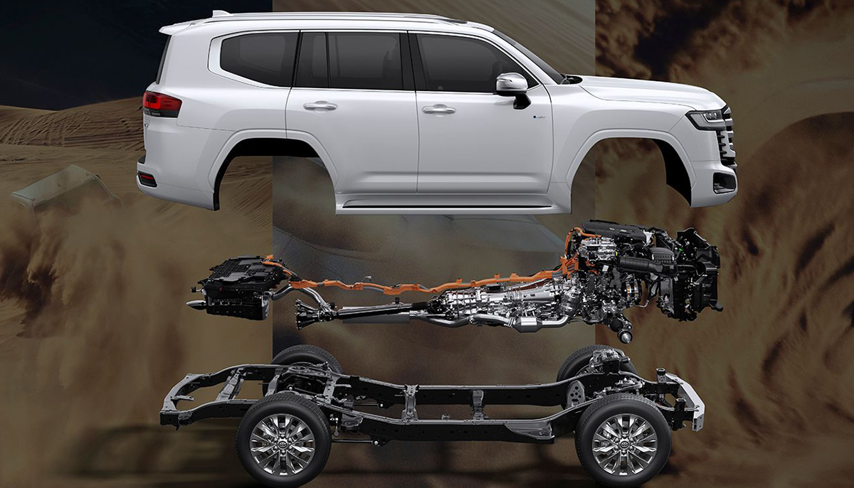 The Land Cruiser 300 Hybrid shares its powertrain with the Lexus LX700h. Under the hood is a new 3.5-litre twin-turbo V6 petrol engine, paired with an electric motor generator in a parallel hybrid layout. This combination delivers a total of 457hp, and the hybrid SUV comes equipped with a 10-speed automatic transmission as standard.